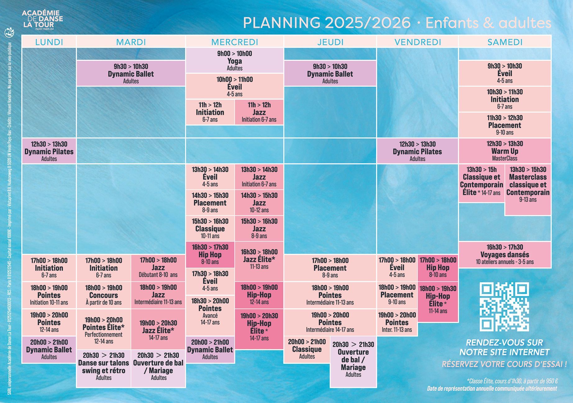 Retrouvez le planning des cours de danse pour la saison 2025/2026 de l'Académie de Danse La Tour.